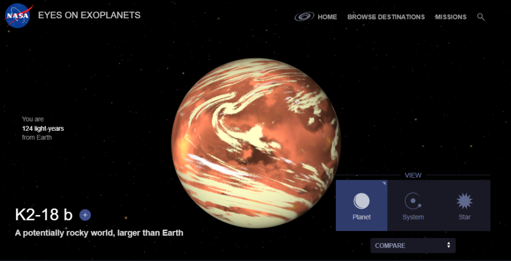 Imagen 2. Visualización artística del exoplaneta K2-18 b creada por NASA. Fuente: NASA Eyes on Exoplanets.